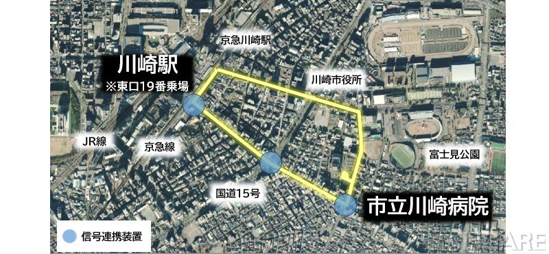 また、川崎駅前南交差点など3カ所に信号連携装置を設置し、信号残時間をバスに送信することで安全かつ円滑な走行を目指す。