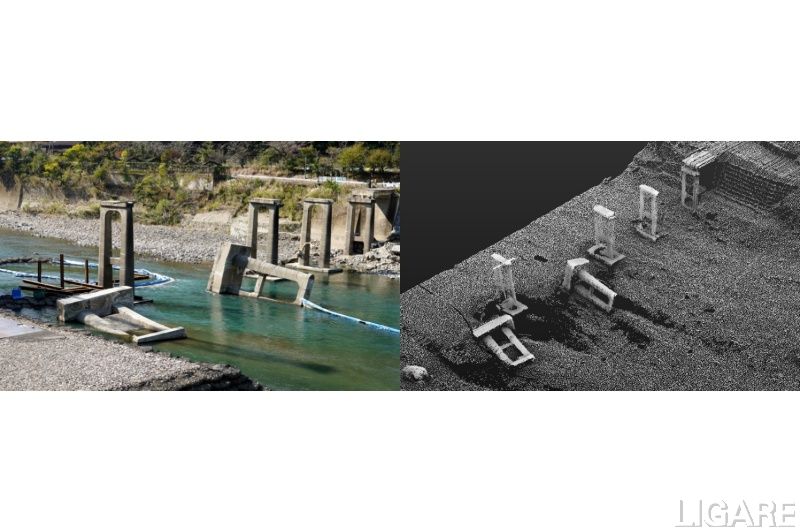 同実証は、水に吸収されにくいグリーンレーザーの使用で水中の3D地形でも可視化可能なamuse oneselfのドローンレーザースキャナシステム「TDOT 7 GREEN」と、KDDIが提供する3D点群圧縮ソフトウエアをドローンに搭載し、上空から地形や地物の3D点群データの伝送を実施した。