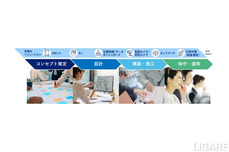 同ソリューションは、働く空間・訪れる空間の新設、移転、リノベーションを検討されている利用者に対して、コンセプト策定から設計、構築・施工、保守・運用を一気通貫で支援するというものだ。利用者のニーズに合わせて、コンセプト策定時から通信・ロボット・AIなどのテクノロジーを起点に設計するため、構築・施工段階における再設計・再工事のリスクを低減する。