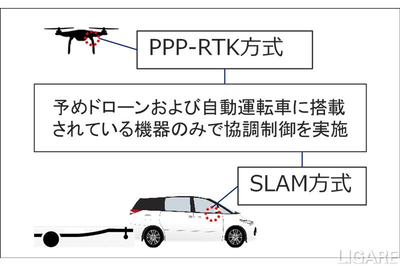 具体的には、自動運転車にはSLAM方式、ドローンにはPPP-RTK方式と測位方式を採用し、2社が開発した「協調制御プラットフォーム」を活用することで連携。自動運転車とドローンがお互いの位置情報を把握して協調動作できることを確認している。