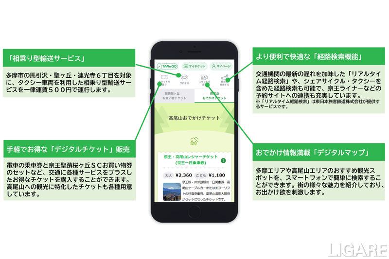 今回の実証実験では、スマートフォン専用サイトを利用して、「交通サービスの統合」、「ラストワンマイルの補完」、「生活利便性の向上」、「エリアの魅力発信」の4点からさまざまなサービスを提供する。「TAMa-GO」では1月13日から、京王線乗車券に京王聖蹟桜ヶ丘ショッピングセンターのお買い物券や多摩モノレール・京王線乗車券、京王高尾山温泉/極楽湯入館券などがセットで購入できるデジタルチケットを販売する。また、多摩エリアや高尾山エリアのお出かけスポット情報が掲載されたデジタルマップにより「移動が便利になる・移動したくなるサービス」を提供する。