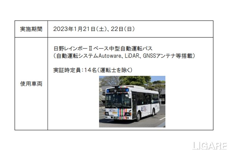具体的な検証項目としては、技術検証項目として、車両・自動運転技術の検証と道路環境・交通環境への適用検証を実施する。車両・自動運転技術の検証では、LiDARによる自社位置推定技術、遠隔監視などを検証する予定だ。また、サービス検証項目としては、自動運転バスの社会受容性の検証と、自動運転バスサービスの事業性の検証を実施するという。