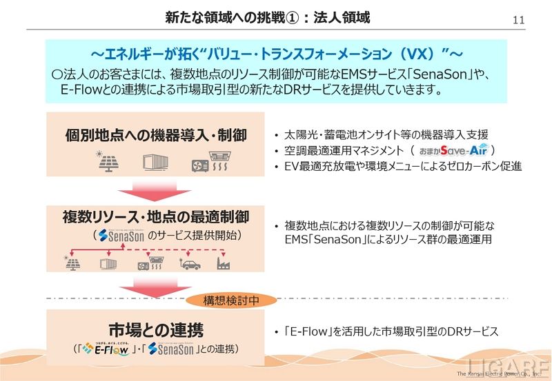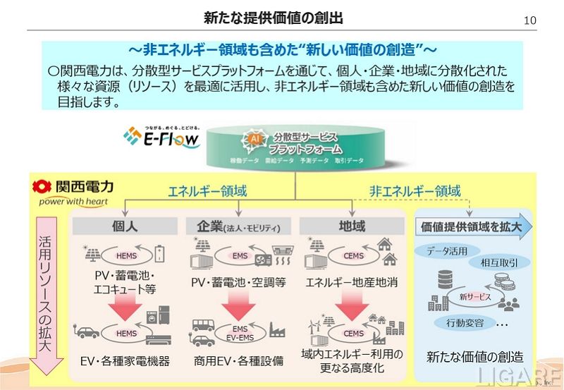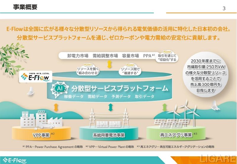 E-Flowは、関西電力の100%子会社であり、法人利用者が所有する分散型リソースから得られる電気価値を活用し、利用者に代わって最適な市場取引を行う。2030年度までに売上高300億円を目標に、全国で事業展開を目指している。