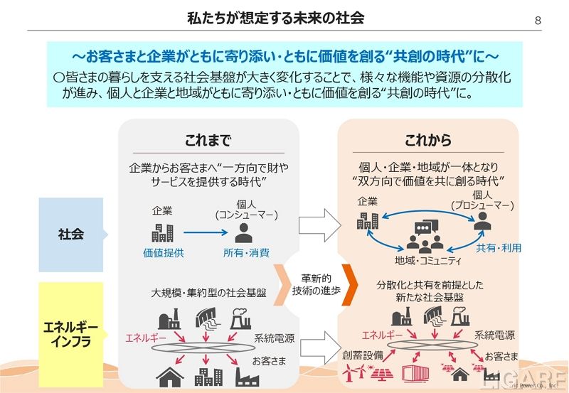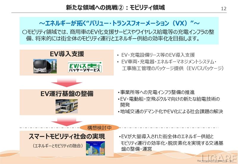 ほかにも、同社は、新たに挑戦する領域として、法人領域とモビリティ領域を掲げている。モビリティ領域ではEV導入支援やEV運行基盤の整備、将来的にはスマートモビリティ社会の実現という構想を検討中だ。