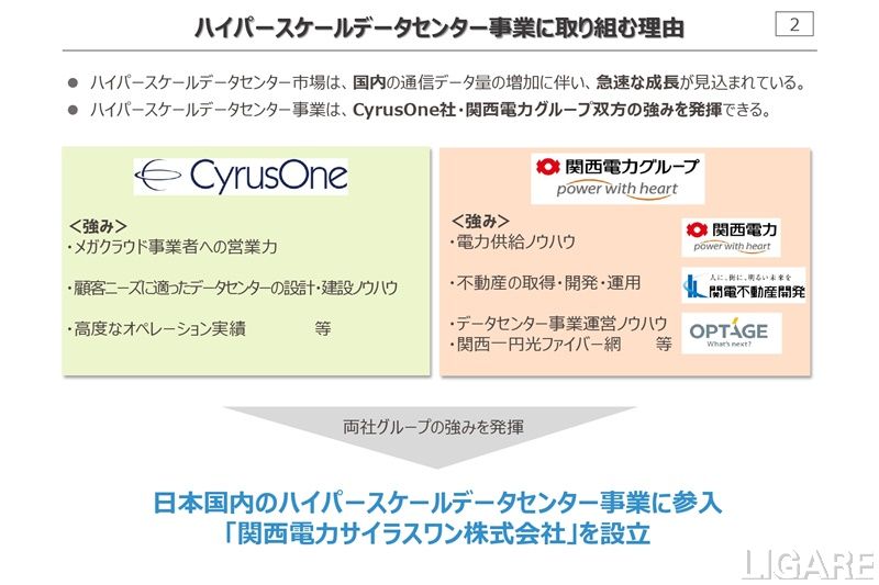 また、サイラスワン社は、HSDC事業において、規模と成長の両面で世界をリードしており、営業力や設計・開発・運営に関する高いノウハウを有している。一方、関西電力は、エネルギー・不動産・情報通信など、幅広いグループ事業を展開しており、日本におけるHSDCの開発・運営に必要なノウハウを有している。