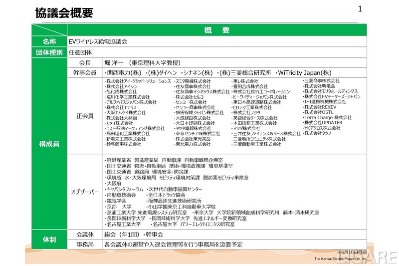 関西電力株式会社(以下、関西電力)は6月10日、株式会社ダイヘン、シナネン株式会社、株式会社三菱総合研究所、WiTricity Corporationの4社とEVワイヤレス給電協議会設立発起を発表した。