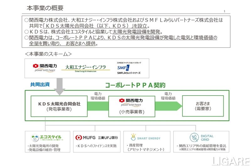 今回の取り組みは、関西電力、大和エナジー・インフラ株式会社、およびSMFLみらいパートナーズ株式会社の3社で実施する。KDSは、株式会社エコスタイルと協業し、2025年度末までに、関西・東京・中部エリアで最大15万kWの電源開発を行う予定だ。さらに、関西電力は、コーポレートPPAにより、KDSの太陽光発電設備が発電した電気と環境価値の全量を購入し、利用者へ提供するという。