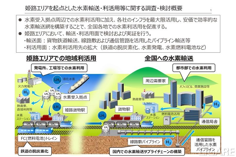 具体的な調査・検討概要としては、水素受入拠点周辺での水素利活用にくわえ、各社のインフラを最大限活用し、安価で効率的な水素輸送網を構築することで、全国各地での水素利活用を促進する。さらに、姫路エリアにおいて、輸送・利活用面で検討および実証を行う予定だ。輸送面としては、貨物鉄道輸送、線路敷および通信管路を活用したパイプライン輸送等を実施。一方、利活用面では、鉄道の脱炭素化、水素発電、水素燃料電池など水素利活用先の拡大を調査・検討する。
