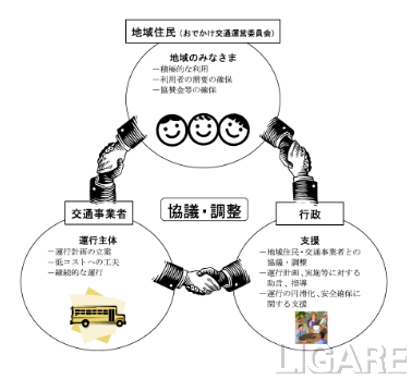 おでかけ交通は道路運送法第4条に基づく「一般旅客自動車運送事業」の定時定路線型と自由路線型で運行されている。三者の役割は次の通りだ。地域住民は、運営委員会を立ち上げ、積極的な利用を住民に促し、需要者や協力金などの確保を行う。行政の担当は住民や事業者との協議・調整、運行に対する助言・指導、助成など。交通事業者は運行主体となり、運行計画の立案、コスト低減の工夫、継続的な運行を担っている。