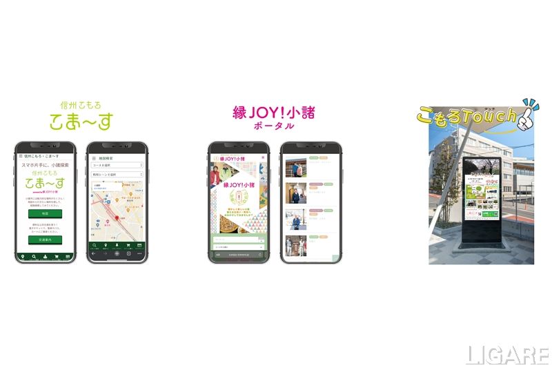 DXによる情報発信では、地図情報型サービス・LINE公式アカウント「信州こもろ・こま~す」と、まちなか等の新コンテンツ提供サービス・Webサイト「縁JOY!小諸ポータル」とを相互連携する。これにより、自宅でも外出中でも小諸の情報を“発見”できる。さらに、小諸駅と懐古園、こもテラス・ツルヤ小諸店に、データ連携したデジタルサイネージ「こもろタッチ」を設置し、シーンに応じた情報提供を行う予定だ。