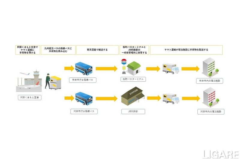 九州産交バス株式会社(以下、九州産交バス)とヤマト運輸株式会社(以下、ヤマト運輸)は、路線バスを活用した貨客混載で観光客の手荷物を配送する「手ぶら観光サービス」の実証実験を3月23日から開始する。3月17日付のプレスリリースで明かした。