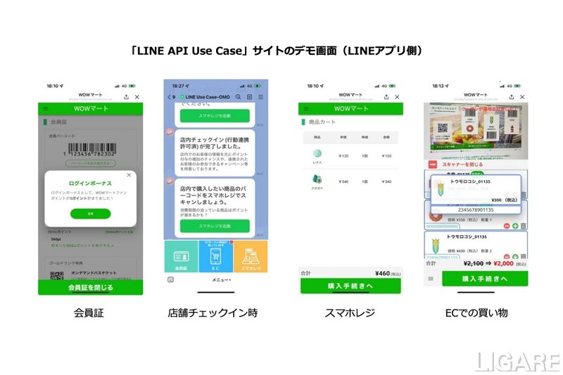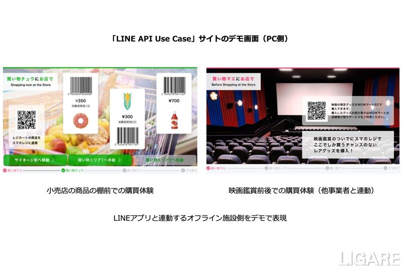 また、LINEは、「LINE API Use Case」上で、小売業界に特化したコンテンツ「デジタル時代の新しい購買体験をLINEで」を公開した。同コンテンツでは、オフラインとオンラインが融合した(Online Merges with Offline)、横断的なカスタマージャーニーをデモで紹介している。例として、会員証の提示やオンデマンドバスによる店舗への移動、スマホレジによる購買手続きなどを挙げている。