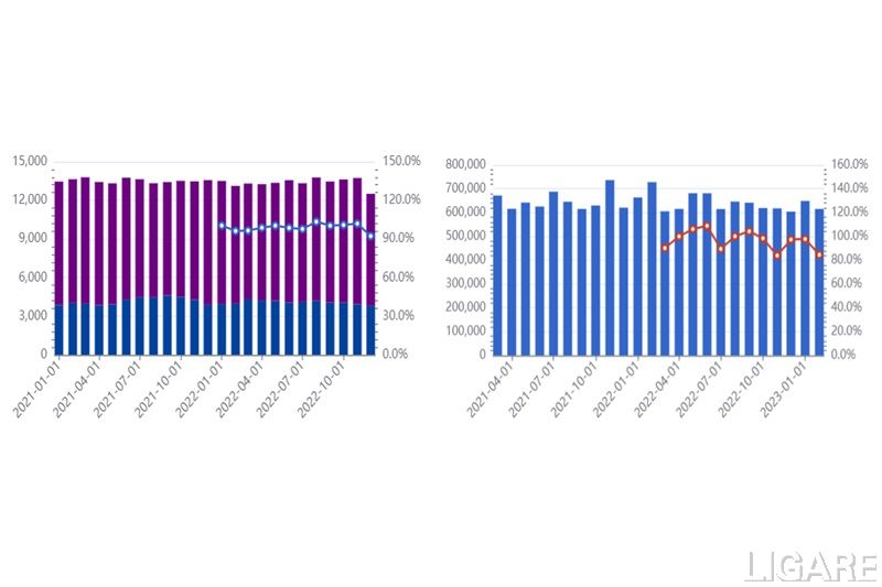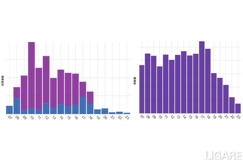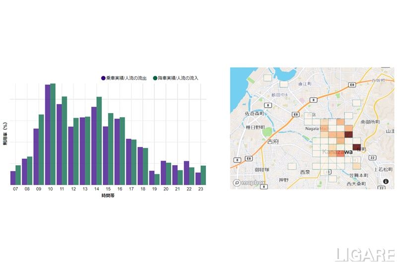さらに、「人流と交通の利用率の確認」では、人流データと交通の移動実績データを比較し、実際の移動状況に対する交通移動実績の割合を可視化できる。モニタリングによって利用率に変化があった際、利用率が高くなったのか低くなったのか、どの乗降場所で時間帯はいつなのか、などが把握可能だ。