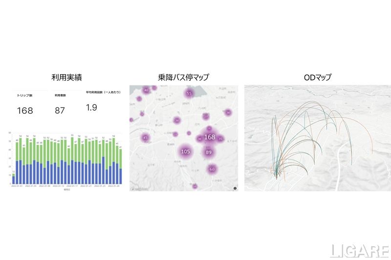 また、同社は、交通分野のデジタル化やデータ活用にこれから取り組もうとしている自治体・事業者向けに、「SeeMaaS」のスターターエディションも提供する。スターターエディションは、公共交通の利用状況や利用者の移動実態を把握するためのODデータ※の取得・可視化に特化したプランだ。交通系ICカード等からデータを取り込み、利用者数・利用回数などの利用実績を数値やグラフにより可視化する。運行情報と合わせることで、各停留所の利用状況やODを地図上で可視化することが可能だ。これにより、特定のバス路線や停留所の利用者数などを視覚的に把握することができ、運行本数・路線の適正化や、利用促進施策などの定量的な評価ができる。