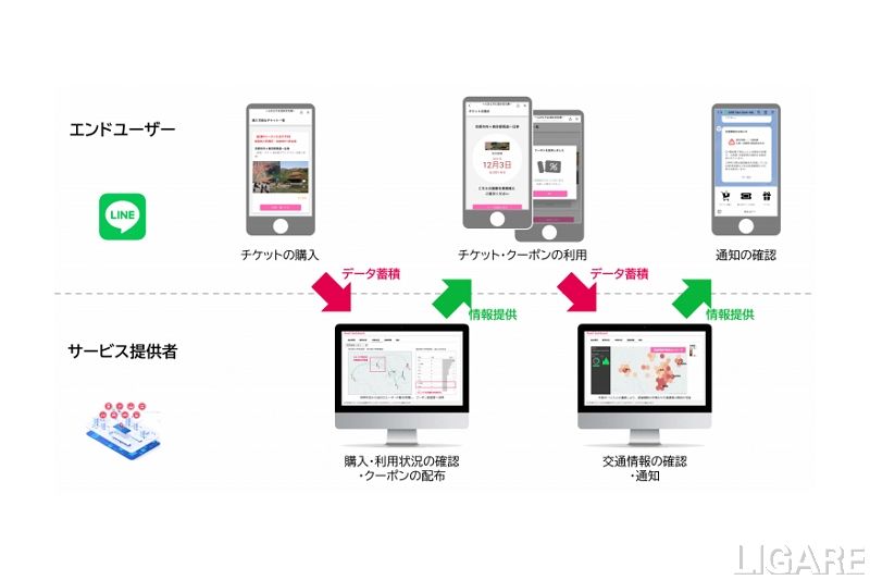 今回発表した内容は、移動に関するさまざまなデータを統合し、TraISAREに交通チケットやクーポン利用状況を蓄積するというものだ。さらに、公共交通の遅延や混雑情報などリアルタイム運行情報を連携させることで、一人一人の状況に合わせた情報を「LINE」を通じて提供する。