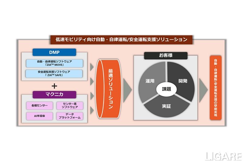 両社は、こうした社会・産業構造変化に対応すべく、特に低速度領域における自動・自律運転のハードウエア・ソフトウエアのプラットフォームの構築・提供を目指す。組み合わせる技術は、DMPのAIを活用した自律運転技術および安全運転支援技術と、マクニカのセンサー、AI半導体ならびにデータ収集含めた実証実験のノウハウや運営力、営業力だ。