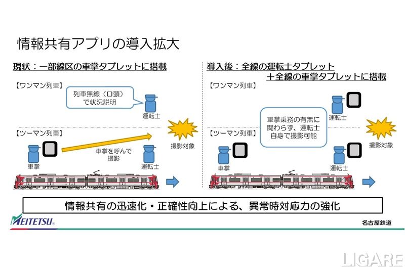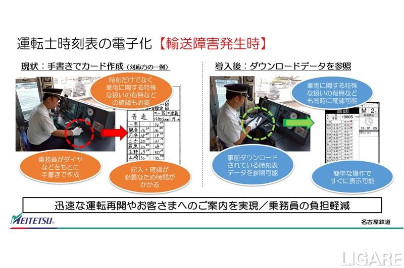 なお、名古屋鉄道は、今後運転士用タブレット端末の機能を拡充するため、GPSを活用した運転士支援機能や情報伝達機能などを順次開発・搭載し、輸送品質の向上を図る。さらに、運転士用タブレット端末の導入にあわせて、既存の車掌用タブレット端末の導入線区を全線に拡大するとともに、紙製の車掌用時刻表についても電子化すると述べている。