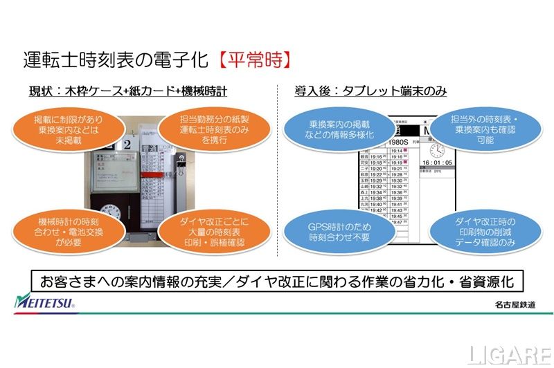 同端末は、名古屋鉄道と株式会社メイテツコムが共同開発したものだ。同端末を導入する主な目的は「運転士用時刻表の電子化」、「情報共有アプリの導入拡大」、「サービス向上」だ。具体的には、「運転士用時刻表の電子化」では、従来の紙製運転士用時刻表を廃止し、タブレット端末に運転士用時刻表データを配信する。これにより、輸送障害時においても迅速な案内や対応を実現するとともに、紙の使用量を削減する。
