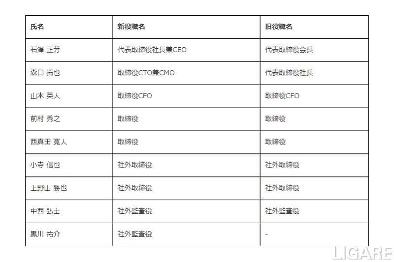 今回の人事では、石澤正芳氏が、代表取締役会長から代表取締役社長兼CEOに異動した。また、森口拓也氏が、代表取締役社長から取締役CTO兼CMOに異動している。