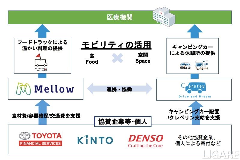 両社のほか、協賛企業としてトヨタファイナンシャルサービスとKINTOが参画し、キャンピングカー提供やフードトラック派遣・食事提供にかかる費用などを支援している。そのほか、デンソーも除菌、消臭のための「車両用クレベリン」の無償提供を行っている。