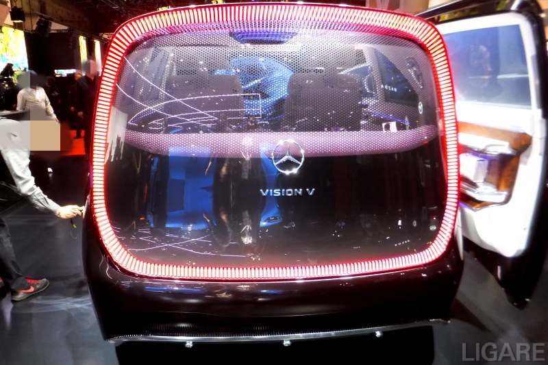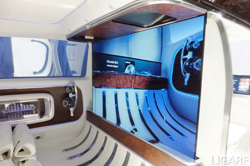 後部座席と運転席の間仕切りやサイドウィンドウには、透明度を自在に切り替えられるスマートガラスを備え、プライバシーを確保した。スマートガラスには極小の液晶が内蔵されており、電圧でその並びを制御することで透明度が変わる仕組み。