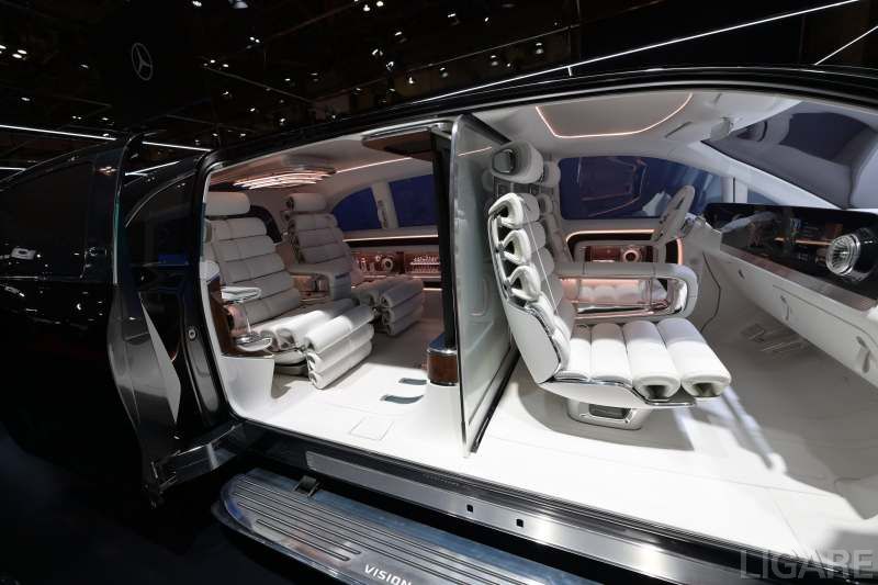 このコンセプトを具現化するため、ミニバンでありながら4人乗りとし、後部座席を広く開放的な空間とした。シートは、人間工学に基づく設計により快適さを追求。ポリッシュ仕上げのアルミニウム製ベースの上に、チューブ状のクッションを重ねて構成し、未来感のあるデザインに仕上げた。素材には、クリスタルホワイトのナッパレザーとホワイトシルクを使用。また、ドアや天井にもレザーを取り入れている。