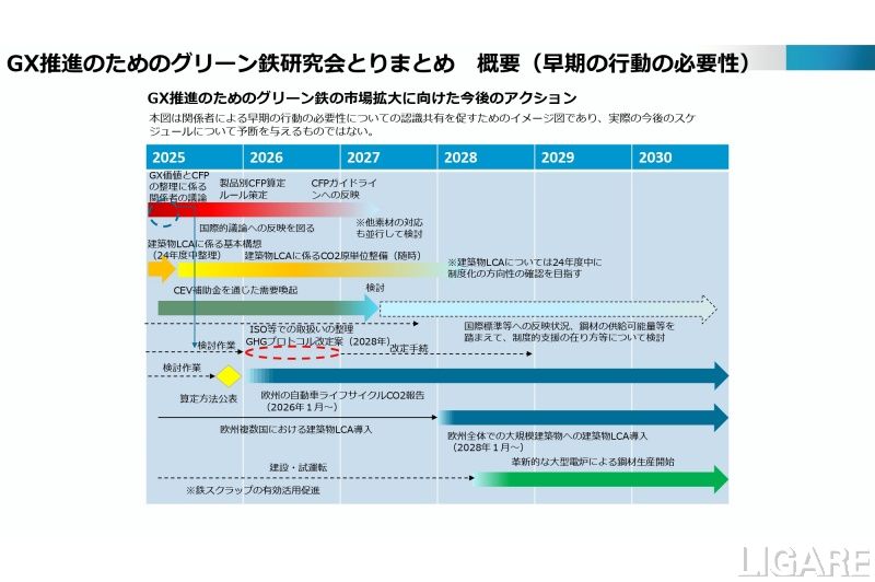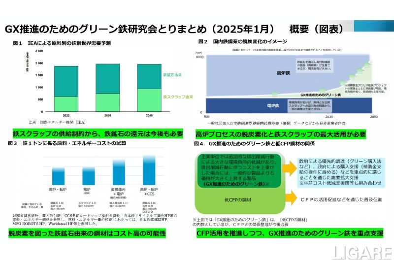 同研究会の目的は、GX投資を促進し、鉄鉱石還元時のCO2排出量を削減しつつ、必要な鋼材を供給することだ。これにより、「グリーン鉄」(グリーンスチール)市場の拡大を目指している。今回のとりまとめでは、対策として、「GX価値の訴求、国際標準への反映」、「鋼材のCFP活用拡」、「需要側への支援」、「供給側への支援等」を挙げている。
