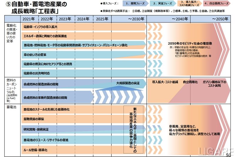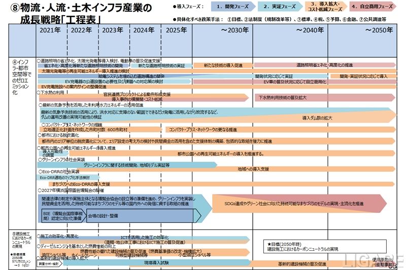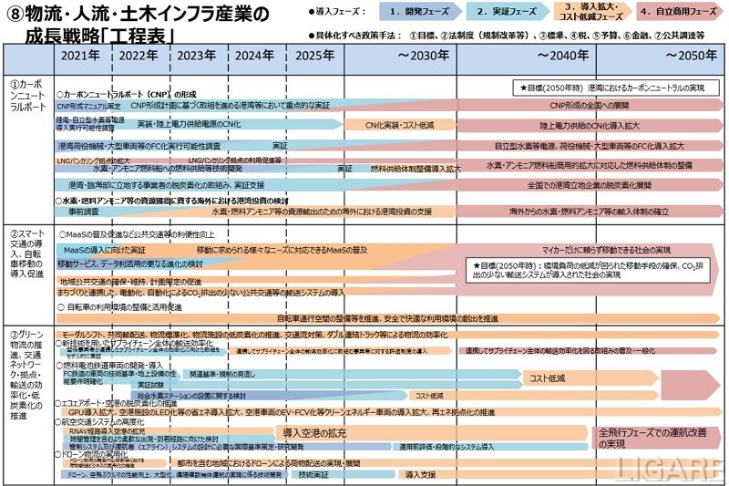 「物流・人流・土木インフラ産業」では、自動車を運転できない高齢者等にとって、利便性の高い公共交通サービスの実現をメリットとして挙げている。LRT・BRTや電気自動車等のCO2排出の少ない輸送システムの導入の推進も、掲げているメリットの1つだ。なお、今回の戦略の全文は、2050年までの工程表も含めて、以下で公開されている。