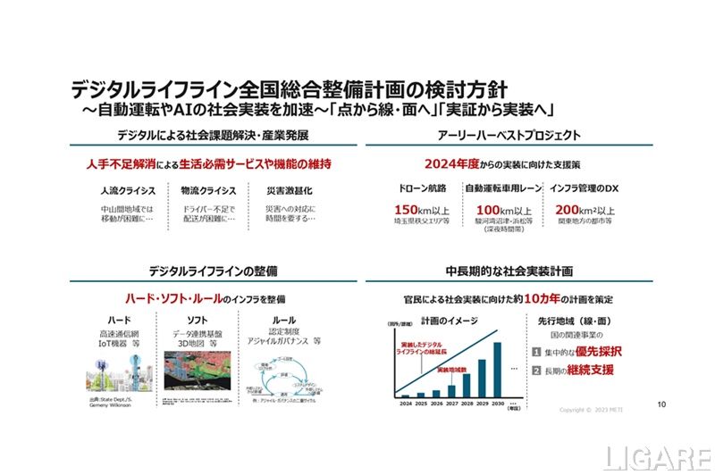 同省は、2023年度内に約10カ年のデジタルライフライン全国総合整備計画を策定している。この計画の目的は、官民で集中的に大規模な投資を行い、自動運転やAIによるイノベーションを線・面で社会実装することで働き手の賃金の向上を実現することだ。同時に、人手不足や災害激甚化といった社会課題の解決を図るという。