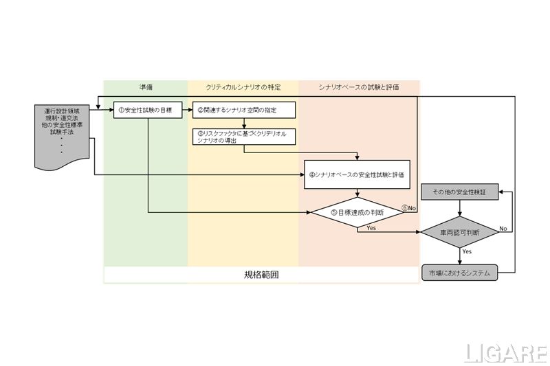 同基準は、自動運転システムの安全性を評価する手順や、クリティカルシナリオ(自車にとって危険と認知した場合に即座に安全行動を行う必要がある事象)の導出手法等から構成されている。具体的には、「安全目標の設定」、「シナリオ検証範囲の設定」、「危険な事象に至る要因」などだ。