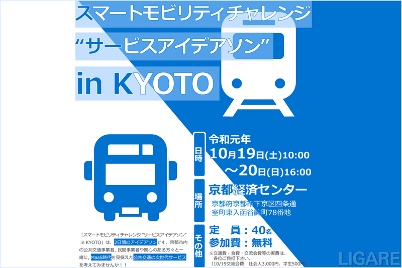 経済産業省では2019年4月より、新たなモビリティサービスの社会実装を通じた移動課題の解決や地域活性化に挑戦する地域や企業を応援する新プロジェクト「スマートモビリティチャレンジ」を開始している。このプロジェクトの一環として、様々な社会課題に向き合う京都市及び同市で事業活動を行う民間事業者等とともに、MaaS時代も見据え、課題の解決につながるモビリティ関連サービスの創出に向けた“アイデアソン”を開催する。また、優秀なアイデアに対しては、その後、専門的なアドバイザーをつけて、社会実装に向けた支援をする予定。