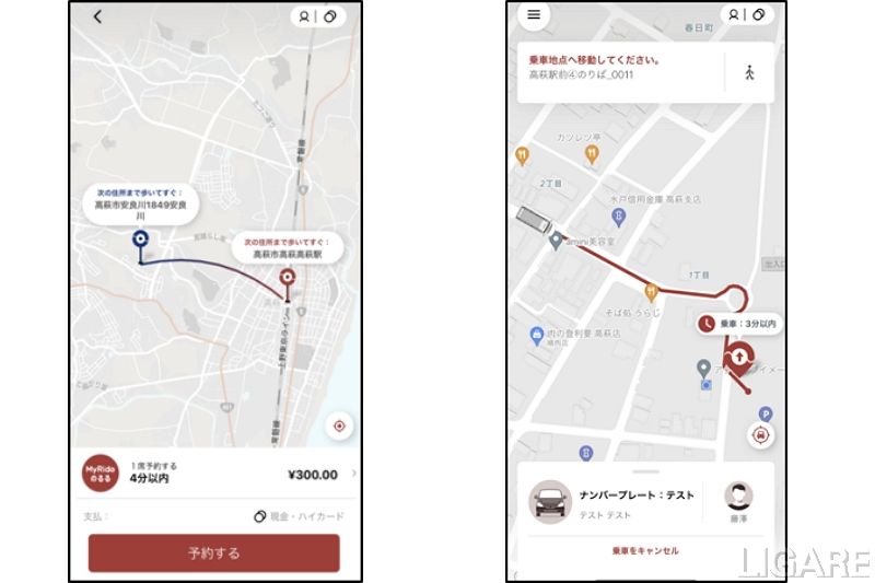 今回の実証運行では、多数の仮想バス停を利用することで、既存バス停よりも希望場所に近い場所での乗降が可能だ。運行時間帯(概ね8:30~15:00)内であれば、利用したいときにバスを呼び出せる。また、利用者は、アプリ画面で乗車するバス停までのルート案内、乗車する車両の現在位置・バス停到着予想時刻、車両情報(ナンバープレート等)を確認可能だ。乗車後は、車両の現在位置と目的地までの経路と予定到着時刻を表示する。