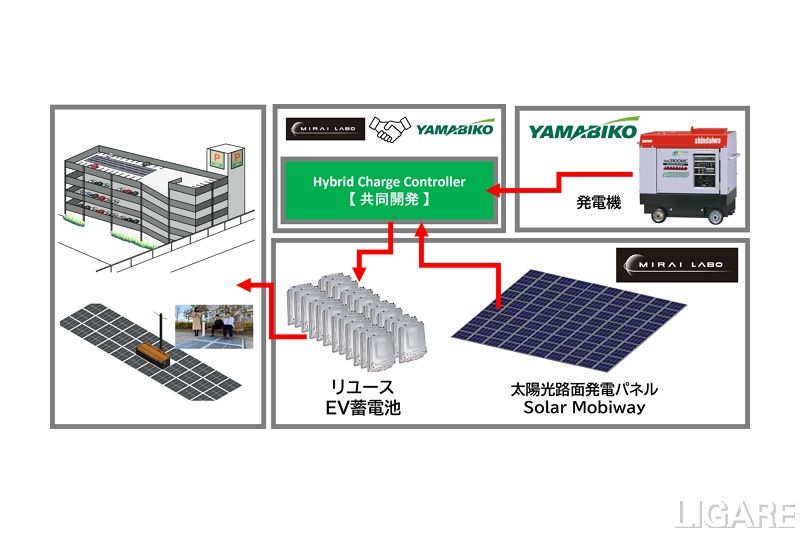 具体的には、MIRAI-LABOの自律型エネルギーインフラAIRとやまびこの発電機を組み合わせる。これにより、天候に左右されず、災害にも強いハイブリッド自律型エネルギーシステムを開発し、事業化を目指す。自律型エネルギーインフラAIRは、MIRAI-LABOが開発する太陽光路面発電パネルとリユースEV蓄電池で構築したものだ。