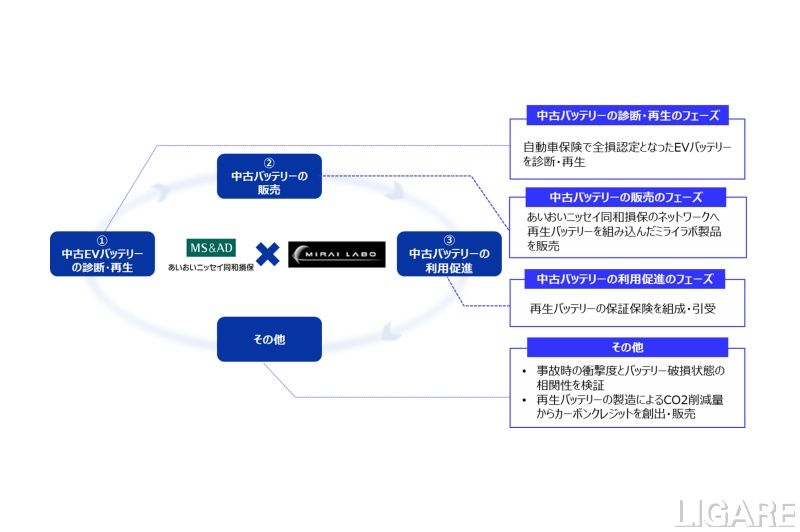 今回の業務提携では、「診断・再生」フェーズで全損EVバッテリーの二次流通(25年5月実証開始)、「販売」フェーズで再生バッテリーを活用した製品を中心としたミライラボ製品の販売、「利用促進」フェーズで再生バッテリーの保証保険の組成を行うという。