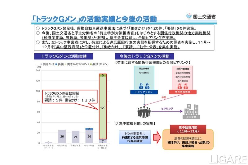同省は7月、トラック運送事業における適正な取引を阻害する疑いのある荷主企業・元請事業者の監視を強化するため、全国162名からなる「トラックGメン」を創設した。「トラックGメン」は、発足後トラック事業者への積極的な情報収集を行い、悪質な荷主に対し、法に基づく「働きかけ」や「要請」を行っている。