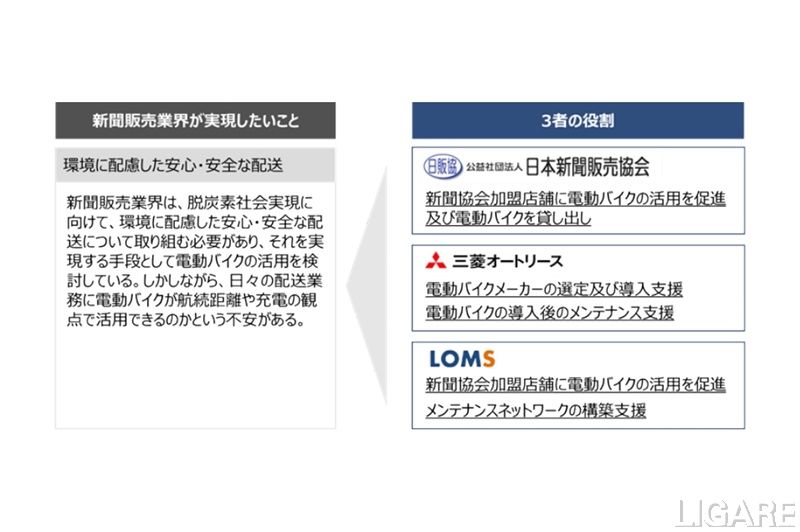 今回の取り組みは、日本新聞販売協会、三菱オートリース株式会社(以下、三菱オートリース)、株式会社ラストワンマイルソリューション(以下、ラストワンマイルソリューション)の3社で実施する。具体的には、日本新聞販売協会が、株式会社ツバメ・イータイム製の「BIZMOⅡ-S」を最初の導入モデルとして、全国の新聞販売協会加盟店舗を対象に、無償貸し出しを開始する。そして、加盟店舗がEVバイクを実際の業務で使用することができるのかを確認する機会を提供する。