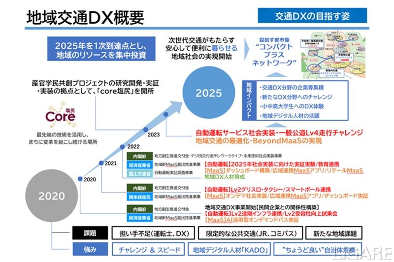同事業の目的は、これまでの実証実験により構築された官民・地域連携体制を活用し、2025年度に市内市街地の生活道路において自動運転レベル4を含む自動運転サービスを社会実装することだ。自動運転事業単独でなくAI活用型オンデマンドバスや各種MaaS関連事業を一体的に社会実装することで、塩尻市における公共交通の利便性向上と、自家用車から公共交通への転換による交通事故の低減を図る。これにより、「次世代交通がもたらす誰もが安心して便利に暮らせる地域社会」への変革(地域交通DX)を進めるという。