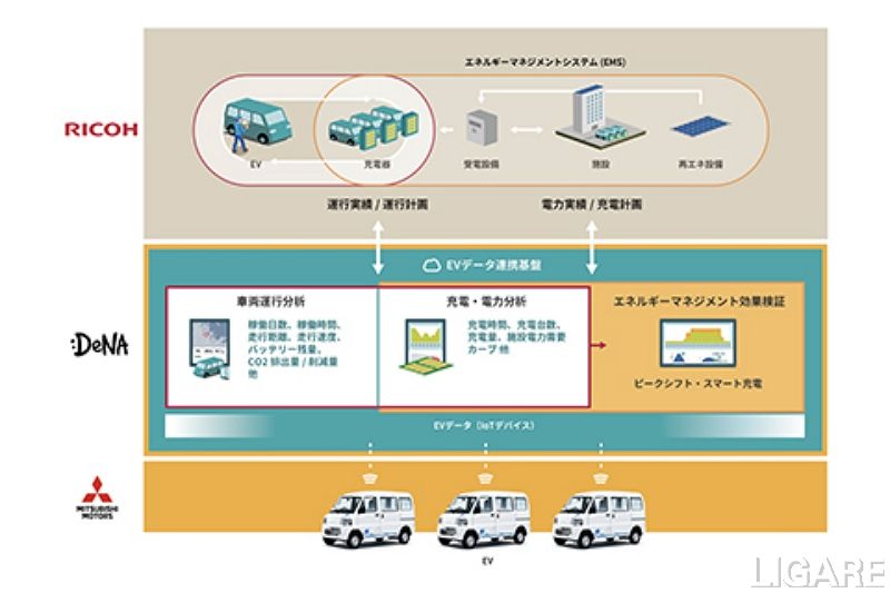 今回の実証実験は、三菱自動車、DeNA、リコージャパン株式会社(以下、リコージャパン)の3社で実施する。具体的には、リコージャパン埼玉支社に営業車として国内唯一の軽商用EVである三菱自動車製「ミニキャブ・ミーブ」を3台導入する。そして、EVの運行データや充電データなどの車両情報、事業所の使用電力データを収集し、同事業所におけるEVの運用状況を分析する。