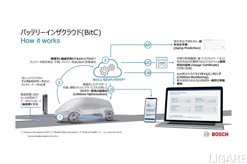 ボッシュは、 “EV電池を見える化”し、EV電池の寿命管理を行うバッテリー・イン・ザ・クラウドという技術を開発した。同技術は、電池を継続的に監視・分析し、ビッグデータの利点を最大限に活用し、電池状態を最適化する。これにより、電池のパフォーマンスと寿命を最大化させ、EV維持費用を低減させる。また、電池交換式プラットフォームは、EVの充電時間を短縮し、高稼働率が要求されている商用車分野における解決手段の一つと考えられている。