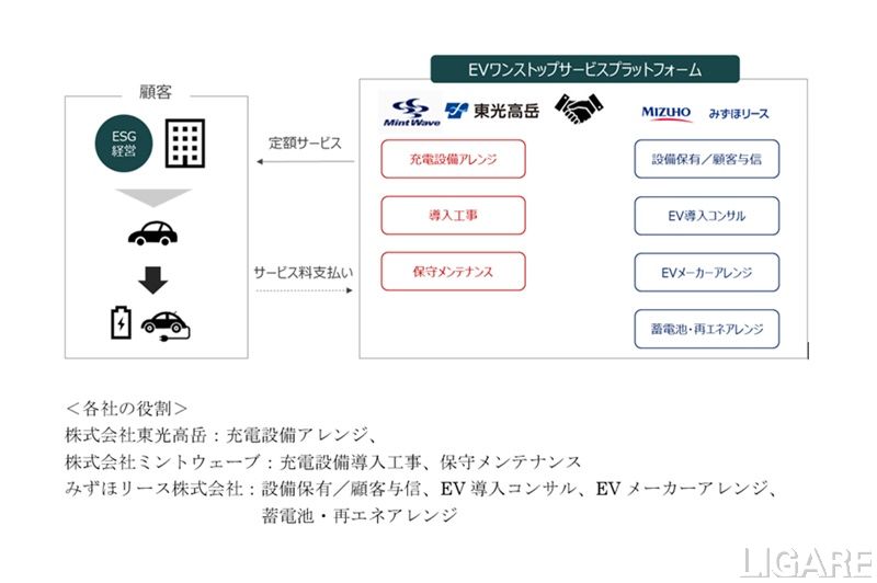 今回の取り組みは、みずほリース、株式会社東光高岳、および株式会社ミントウェーブの3社で実施する。3社は、充電インフラ関連サービスの提供に向けて連携を開始し、2024年4月からのサービス開始を目指すという。