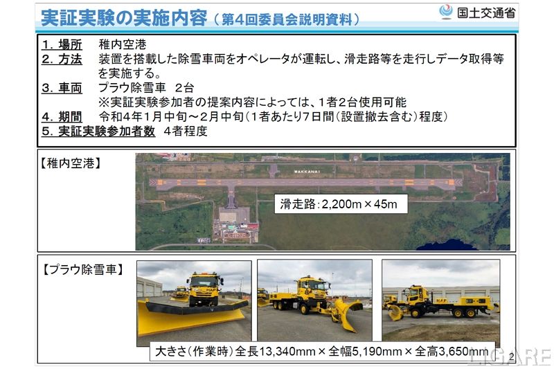 同実証実験は、2021年10月5日から10月25日まで公募を行ったものだ。稚内空港において、実運用している除雪車両に運転支援ガイダンスシステムを搭載。そして、制限区域(滑走路等)を走行したうえで、運用上の課題検証(安全面・実用性等)を実施する。なお、各社の使用する自車位置測定技術や運転支援ガイダンスシステムなどの概要は、以下のURL先で公開されている。