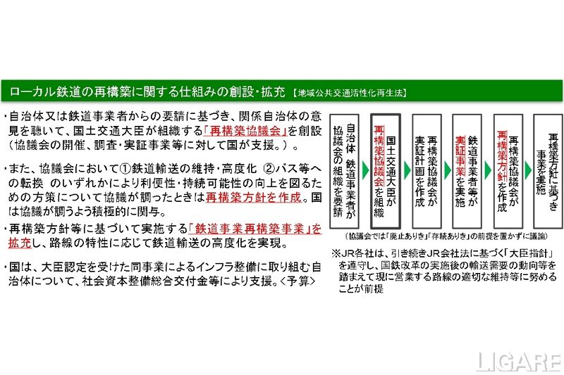 「ローカル鉄道の再構築に関する仕組みの創設・拡充」では、地方公共団体又は鉄道事業者からの要請に基づき、国土交通大臣が組織する「再構築協議会」制度を創設し、協議会において「再構築方針」を作成する。くわえて、再構築方針等に基づき実施する「鉄道事業再構築事業」を拡充した。