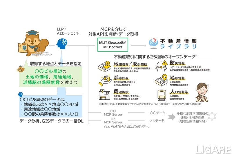 国交省、AIを活用した不動産取引データ取得・活用環境を提供 専門知識なしで周辺施設等の情報も取得可能に 会員限定記事 2026/3/5(木) Post Share Pocket RSS 国土交通省は2月26日、AIを活用して自然言語で多様な地理空間情報を容易に連携・活用できる「地理空間MCP Server-MLIT Geospacial MCP Server-」(α版)を公開した。 ※このコンテンツは会員限定です。無料会員登録すると続きをお読みいただけます。 会員登録済みの方はログインしてください。 ログイン ログイン メールアドレス パスワード ログイン情報を記憶 新規ユーザー登録 パスワードをお忘れですか ? LIGARE編集部h.s AI国交省建設・不動産 Post Share Pocket RSS 関連記事: 国交省、建設分野でフィジカルAI活用へ 土木施工・維持管理・災害対応等を重点対象として想定 作業時間約75%削減 鹿島建設ら、AI等による資機材管理システム開発 健康起因事故防止・解決関連取り組みまとめ【2025年1月~8月】 国交省、AI等を用いた交通運輸分野の研究課題公募開始 スタートアップに優先的な支援を行う枠組みも設定 トヨタ・モビリティ基金、北海道警察・国土交通省北海道開発局等と交通事故削減に向け連携 訪日外国人対策も実施 ドコモ・バイクシェア、新ブランド「NOLL(ノル)」へ刷新。5月1日より新型車両や新料金体系を導入