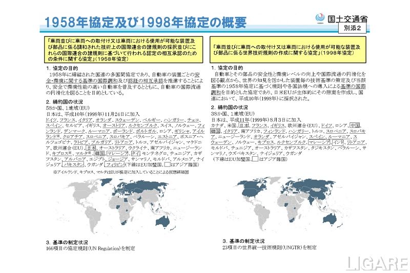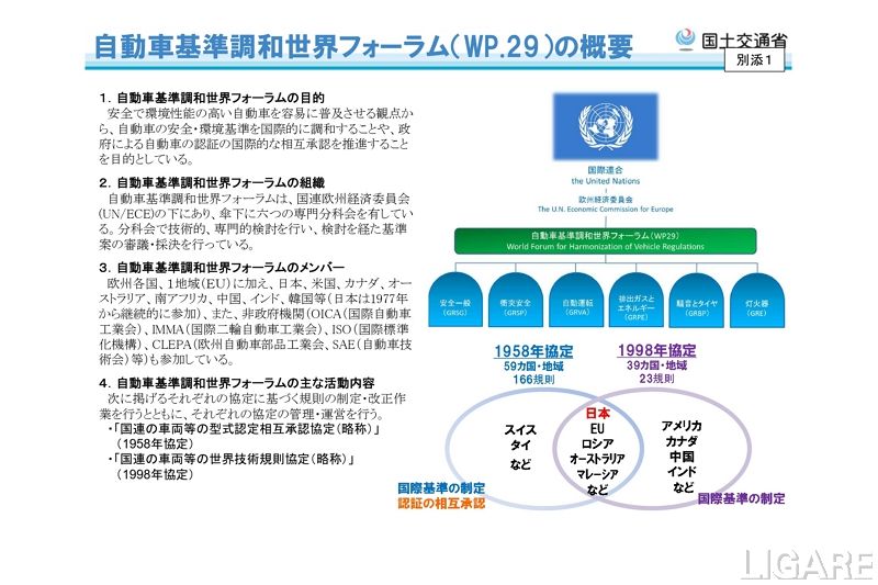 日本は、WP.29において、自動車の安全・環境性能にかかる国際基準の策定等に積極的に参画している。これまでには、WP.29本会議傘下の分科会や専門家会議において、議長や副議長を務め、自動運転技術や運転支援技術のほか電動車にかかる国際基準策定等の議論をリードしてきた。