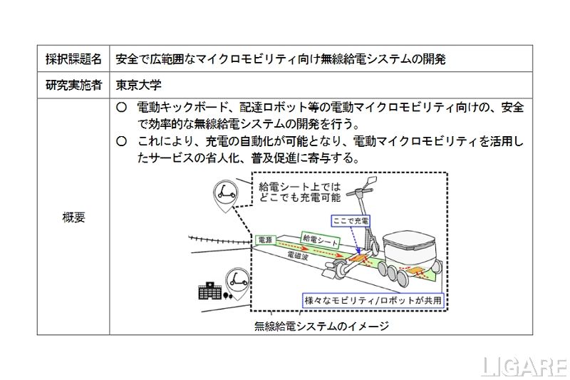 「安全で広範囲なマイクロモビリティ向け無線給電システムの開発」は、東京大学が研究する課題だ。電動キックボード、配達ロボット等の電動マイクロモビリティ向けの、安全で効率的な無線給電システムを開発する。これにより、充電の自動化を可能とし、電動マイクロモビリティを活用したサービスの省人化、普及促進を目指す。