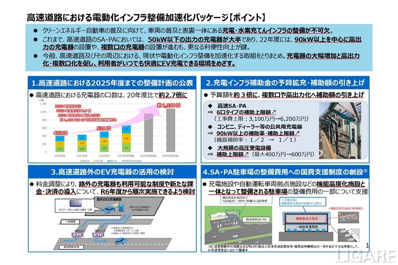 経済産業省および国土交通省は3月29日、「高速道路における電動化インフラ整備加速化パッケージ」のとりまとめを公表した。