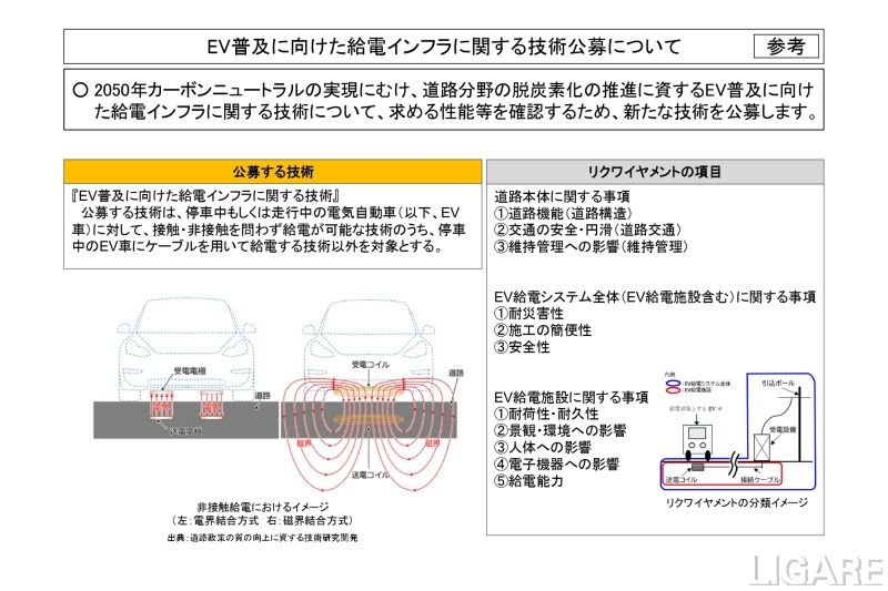 国土交通省は3月26日、EV普及に向けた給電インフラに関する技術について、求める性能等を確認するため、新たな技術を公募することを発表した。