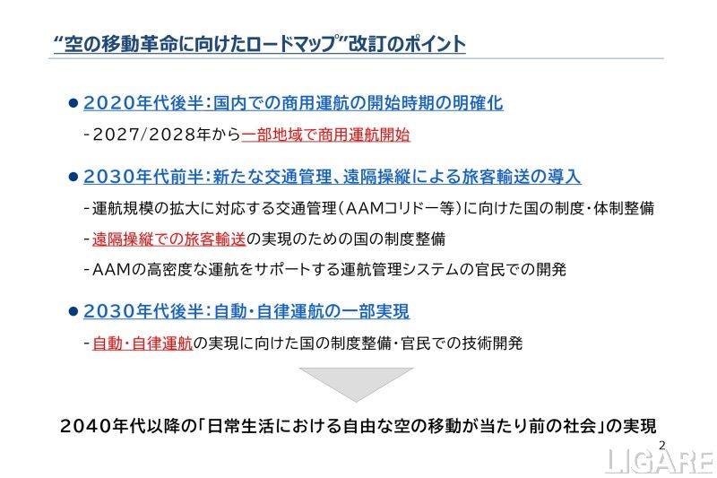 国交省ら、空飛ぶクルマのロードマップ改訂 27~28年に商用運行開始。旅客輸送や自動運行も盛り込む 会員限定記事 2026/3/31(火) Post Share Pocket RSS 国土交通省は3月27日、経済産業省と合同で開催した官民の関係者による「空の移動革命に向けた官民協議会」の第12回会合で実施した空の移動革命に向けたロードマップ改訂を発表した。また、併せて、Osaka Metro、白銀技研、JR東日本の3社が、協議会の構成員として新たに加入することも発表されている。 ※このコンテンツは会員限定です。無料会員登録すると続きをお読みいただけます。 会員登録済みの方はログインしてください。 ログイン ログイン メールアドレス パスワード ログイン情報を記憶 新規ユーザー登録 パスワードをお忘れですか ? LIGARE編集部h.s 国交省空飛ぶクルマ(eVTOL)経産省自動運転販売・整備 Post Share Pocket RSS 関連記事: 国交省ら、新東名高速道路で自動運転トラックの公道走行実証開始 ITS世界会議ドバイで開幕、日本、世界の技術で新たなモビリティ作る トラックの自動運転関連取り組みまとめ【2024年1月~12月】 【特集】「自動運転の旗振り役」が語る、社会実装の現在地と未来/JARI所長・東大名誉教授 鎌田実氏インタビュー Will Smart、東京八重洲のバスターミナル第2期エリアも運営支援 第1期エリアでの管理システムを適用拡大 EIZO、世界初の「レベル4」自動運航船へ映像機器群を実装。将来的な市販化も視野に