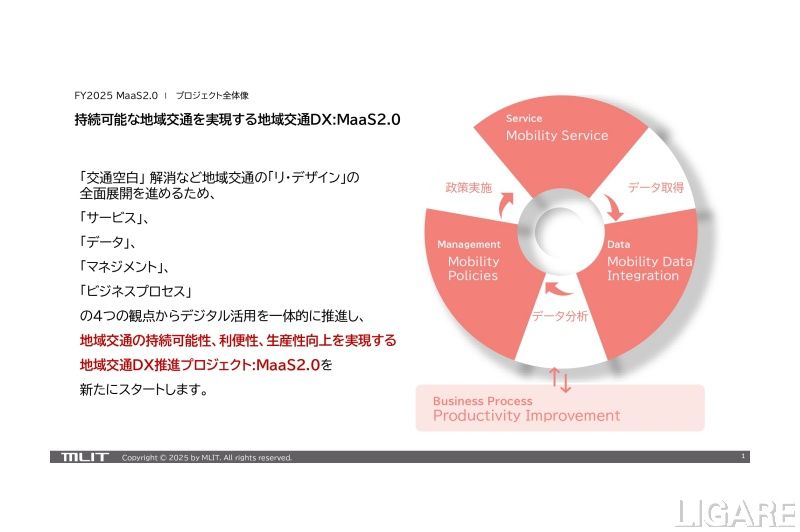 国土交通省は4月1日、2025年度から、「交通空白」 解消など地域交通の「リ・デザイン」の全面展開を進めるため、「サービス」、「データ」、「マネジメント」、「ビジネスプロセス」の4つの観点からデジタル活用を一体的に推進する地域交通DX:MaaS2.0のプロジェクトを新たにスタートすることを発表した。