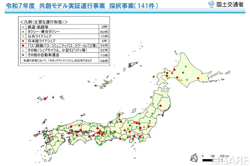 国土交通省は5月15日、2025年度「『交通空白』解消等リ・デザイン全面展開プロジェクト」(「共創モデル実証運行事業・モビリティ人材育成事業」)の公募を行い、「共創モデル実証運行事業」を141件、「モビリティ人材育成事業」を61件の事業採択を発表。全国の「地域の足」「観光の足」を確保するための「交通空白」の解消に向けた取り組みを後押しするという。